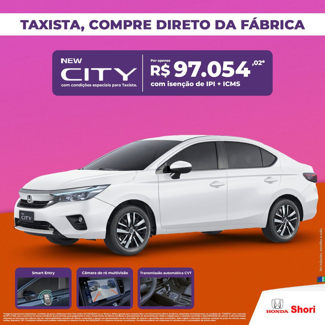 *Imagens meramente ilustrativas. Condição de preço válida para New City Sedam EX 2023/2023 na cor Branco Tafeta apenas para veículos 0km com faturamento direto de fábrica adquiridos exclusivamente na condição de “TAXISTA” com a isenção de IPI e ICMS, sem o acúmulo de outras condições promocionais, para pagamento à vista. Venda Direta de fábrica mediante a apresentação de documentação válida e exigida para a condição escolhida e disponibilidade do veículo. A documentação referente as isenções dos tributos são de responsabilidade exclusiva do cliente comprador e devem ser apresentadas no ato do pedido do veículo e aprovados pela montadora. Valor sujeito à alteração conforme variação do preço do veículo, taxas, tarifas, impostos, CET. Condições válidas para pedidos realizados no sistema Honda até 20/02/2023, ou enquanto durarem os estoques. Condições poderão ser suspensas ou extintas sem a necessidade de prévio aviso.
