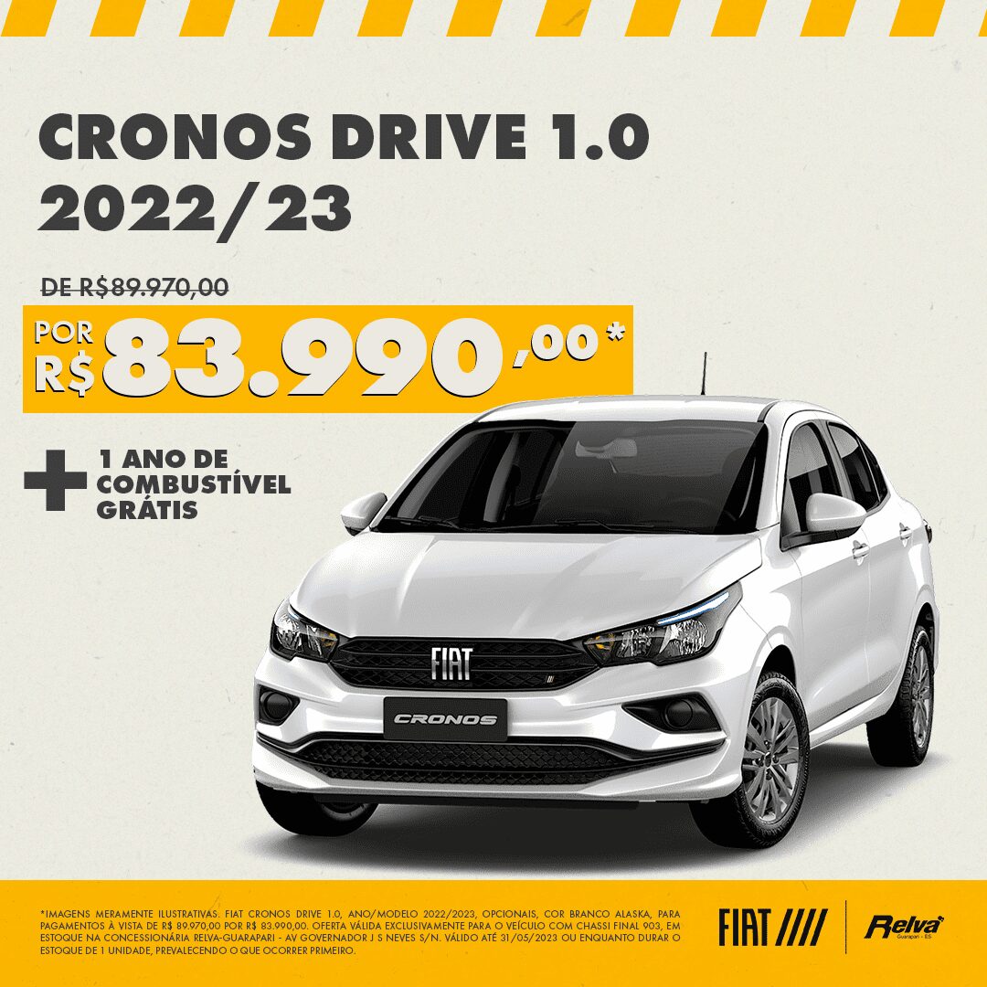 *IMAGENS MERAMENTE ILUSTRATIVAS. FIAT CRONOS DRIVE 1.0, ANO/MODELO 2022/2023, OPCIONAIS, COR BRANCO ALASKA, PARA PAGAMENTOS À VISTA DE R$ 89.970,00 POR R$ 83.990,00. OFERTA VÁLIDA EXCLUSIVAMENTE PARA O VEÍCULO COM CHASSI FINAL 903, EM ESTOQUE NA CONCESSIONÁRIA RELVA-GUARAPARI – AV GOVERNADOR J S NEVES S/N. VÁLIDO ATÉ 31/05/2023 OU ENQUANTO DURAR O ESTOQUE DE 1 UNIDADE, PREVALECENDO O QUE OCORRER PRIMEIRO.
